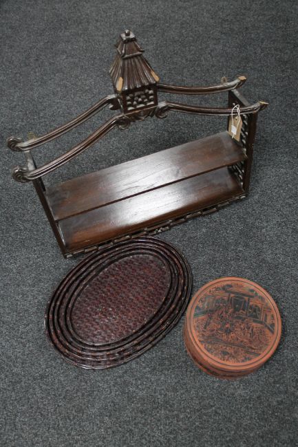 An eastern hardwood wall shelf with pagoda top together with a set of four graduated bamboo and wicker trays and a lidded rice pot