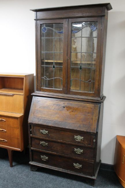 An oak Arts and Crafts bureau bookcase with leaded glass doors