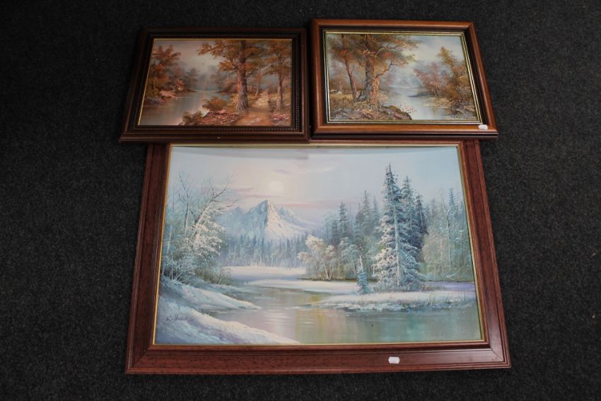 A framed oil on canvas - Winter landscape, by W. Harris, together with two further oils depicting rivers through a woodland