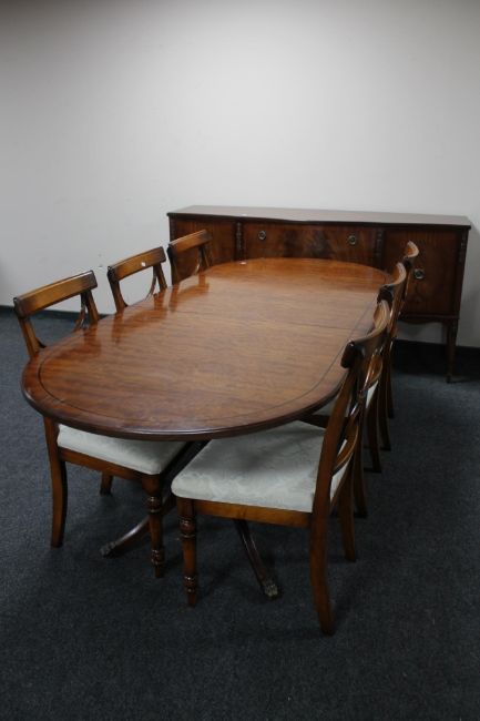 An eight piece Regency style inlaid mahogany dining room suite - sideboard, pedestal extending table with leaf and six chairs