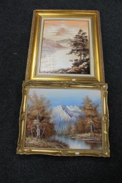 A gilt framed oil on board, Lake scene with mountains beyond, signed Dallas, together with a further oil on canvas, Winter mountain scene