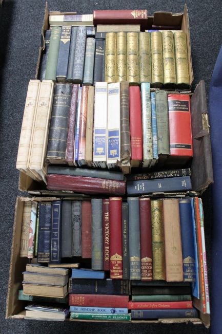 Three boxes containing a quantity of antiquarian and later books including Harmsworth's History of the World, Bunyan's Works etc, together with two albums of Royal Family stamps