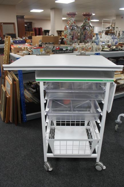 A metal medial trolley with adjustable top, two plastic drawers and wire metal basket