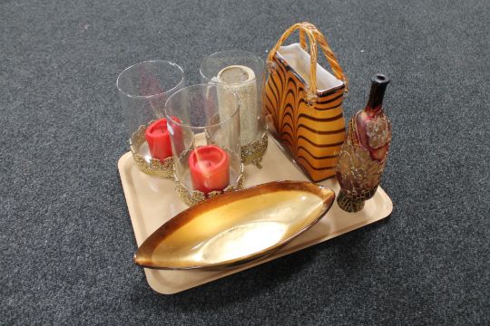 A tray of contemporary glass ware, three candle holders on metal base. shallow bowl, Art Glass style bottle, glass hand bag