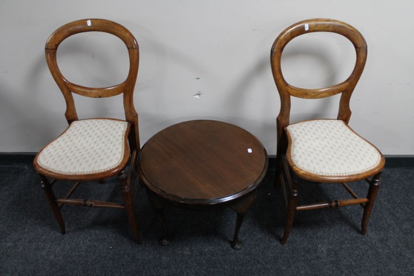 A pair of antique balloon backed bedroom chairs together with a circular mahogany coffee table