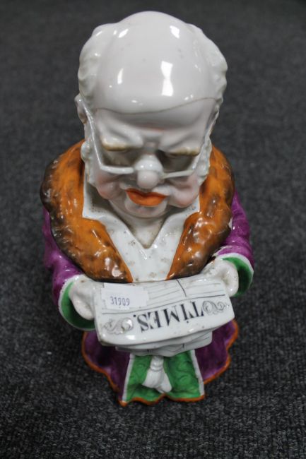 A Victorian ceramic lidded tobacco jar - man reading the Times