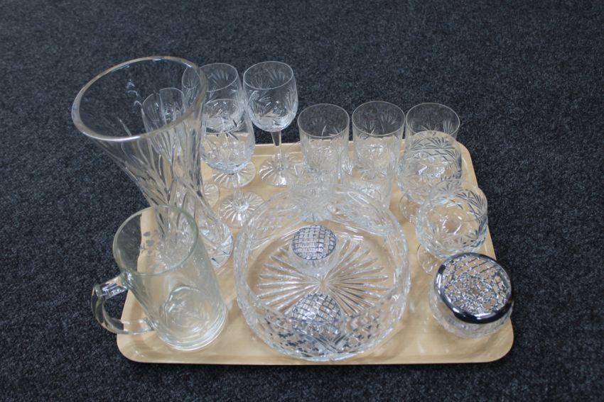 A tray of lead crystal drinking glasses, Edinburgh crystal bowl, three crystal rose bowls etc