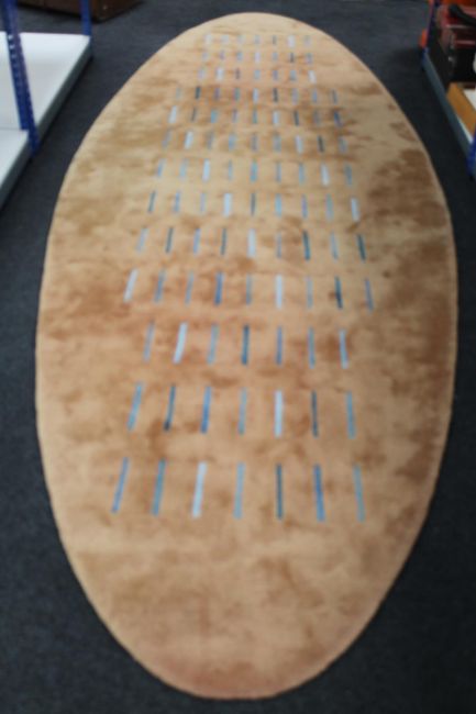 A Kinnasand hand stitched oval wool carpet on peach ground, 440cm by 154cm