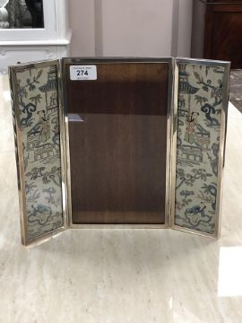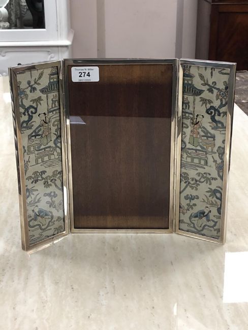 A George V silver three-fold photograph frame inset with two Chinese silk panels, Charles S Green & Co Ltd, Birmingham 1930, height 27cm.