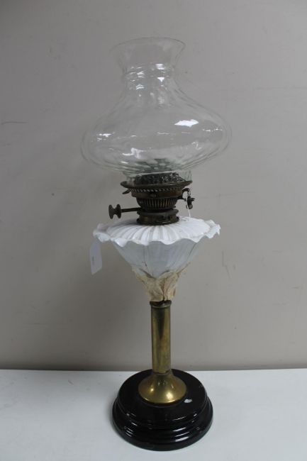 A Victorian Hinks safety oil lamp with glass chimney and shade