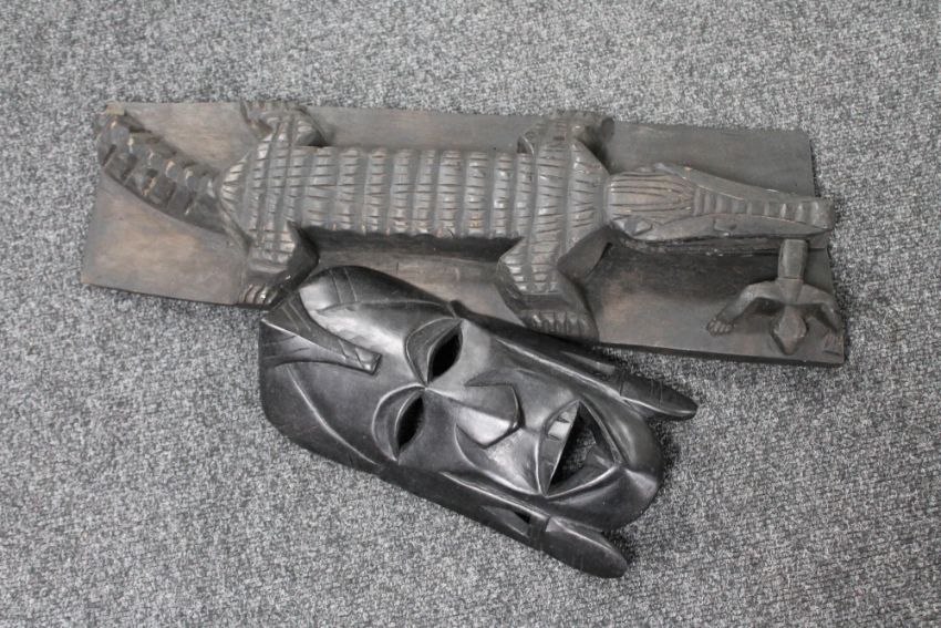 A carved hardwood wall mask together with a carved pine figure of a crocodile eating a man