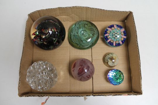 A box of seven assorted glass and crystal paperweights