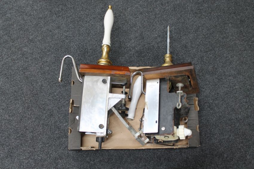 A box of two Masons bar topped beer pumps with brass fittings