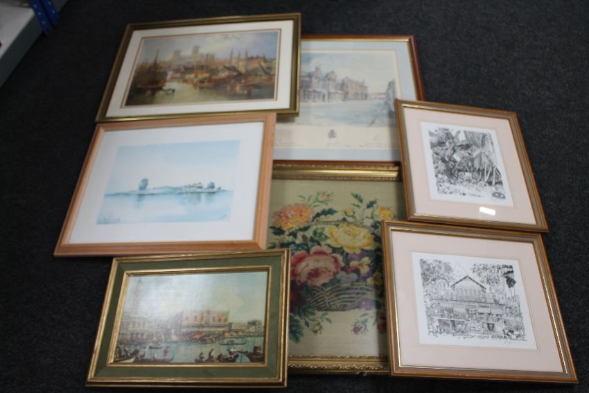 Seven framed pictures - needle works, Venice, signed limited edition prints etc
