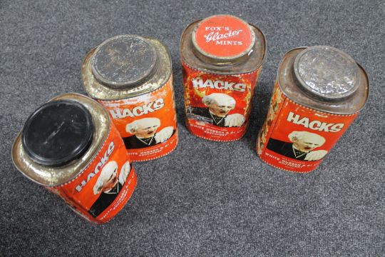 Four vintage metal Hacks tins