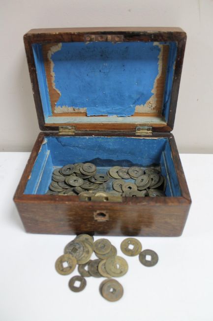 A Victorian walnut box with Chinese coins and tokens