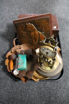 A tray of treen dishes, pipes, copper plaque of cat mounted on a board, anniversary clock Victorian mahogany box (locked)