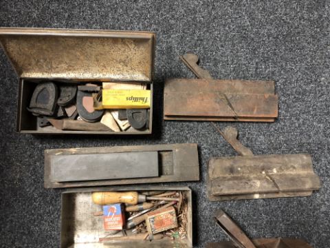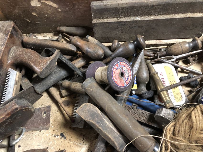 An early 20th century painted joiner's box (wormed) together with a large quantity of assorted woodworking planes, hand tools, Junker and Ruh antique cast iron press