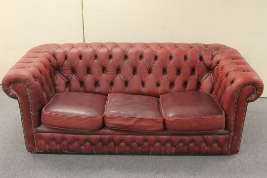 A red buttoned leather three seater Chesterfield settee