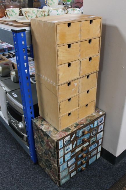 A 20th century miniature six drawer chest with decoupage decoration together with two further miniature six drawer chests