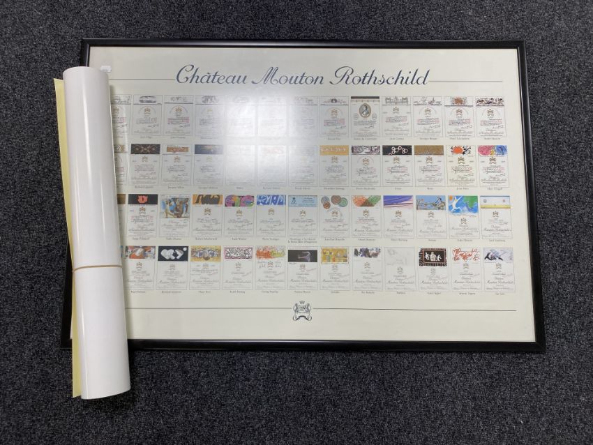 A framed Chateau Mouton Rothschild wine label poster, framed together with an unframed poster