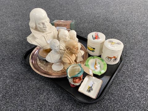 A tray containing eight resin and chalk busts depicting philosophers and Shakespeare, composers, character jug, hand painted Maling ashtray depicting a pheasant etc
