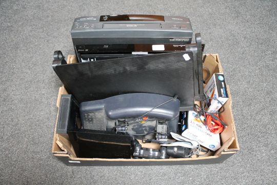 A box of Samsung VCR, Sony blu-ray player with remote, routers, third party playstation controller, foot pedal