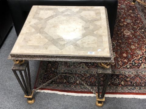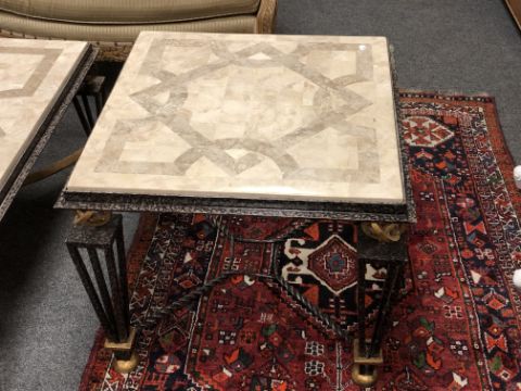 A pair of contemporary marble topped metal based lamp tables, width 65 cm. (2)