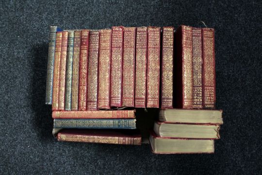 A box of thirteen Everyman's Library leather bound and gilded volumes, Sir Walter Scott, together with a further nine MacMillan's pocket books by Kipling