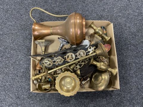A box of antique and later metal wares to include horse brasses on straps, miniature ornaments, copper jug, companion stand