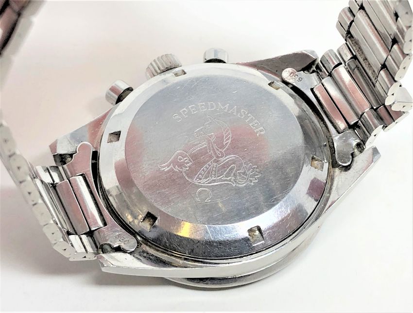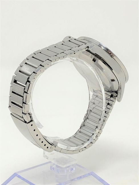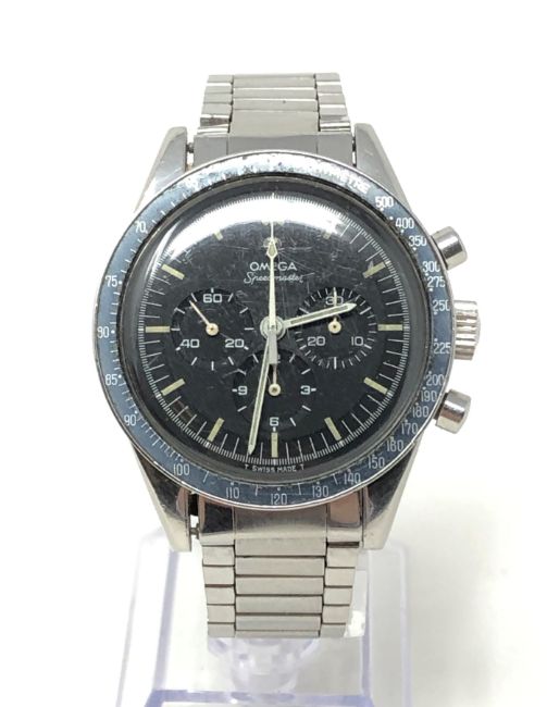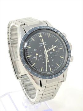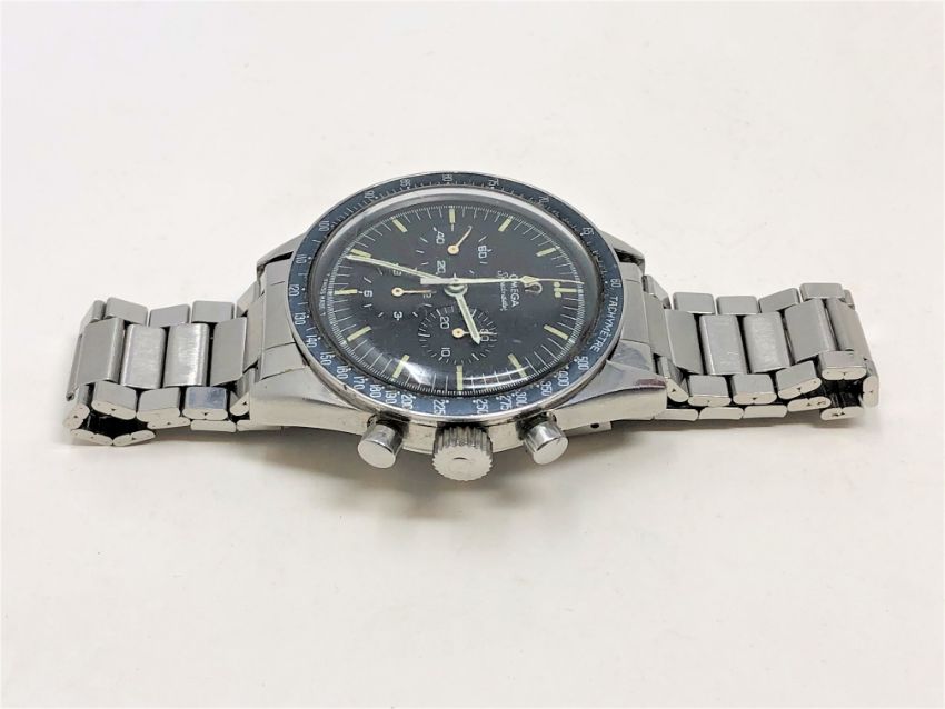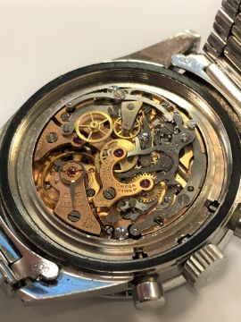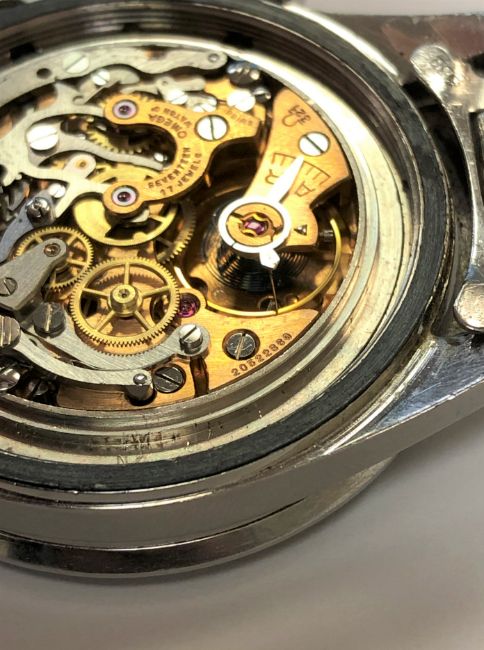 The watch appears to be in excellent condition for its age. The crown winds smoothly and the time adjusts absolutely fine. The chronograph buttons work perfectly and all the dials are changing as they should. The dial and bezel have a good aged patina. When inspected very closely it appears that the counterweight end of the central chronograph hand has been retouched slightly with white paint/enamel. The crown is original. The Omega bracelet is dated '68 and has replacement end-links. A couple of the links are perhaps a little stretched but overall the condition is very good. Both the bracelet and watch case have fine surface scratches commensurate with age and use, but no major dents or deep scratches etc. The case back screws firmly shut. The watch movement appears quite clean and is running fine. The Omega box is in good condition. It is of similar age to the watch but I cannot say with certainty if it is the original. There are no papers.