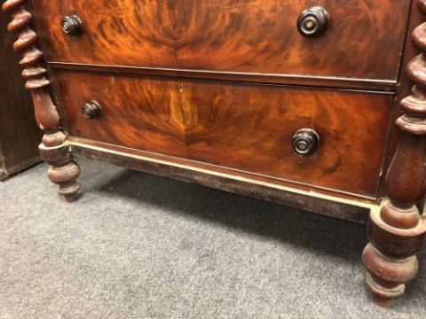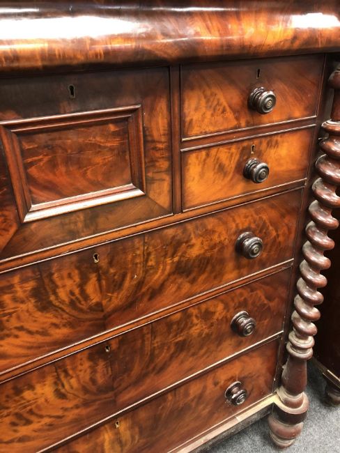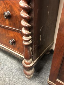 In stable but tired condition. Natural splits to top and sides. Drawers pull out fairly easily but the runners would benefit from a coat of wax. Some handles are loose. White paint to back corners of chest and splashes of paint to top and sides. See images.