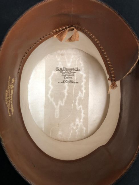 Silk lining good but inner leather head band is torn. Inner measurements are 20cm by 16cm. The inner circumference is approximately 55cm.