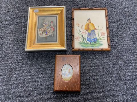 A framed hand-painted ceramic miniature depicting a cockerel, together with a gilt framed butterfly wing print of Spanish dancers and a framed Chinese watercolour of a figure in a garden in faux bamboo frame