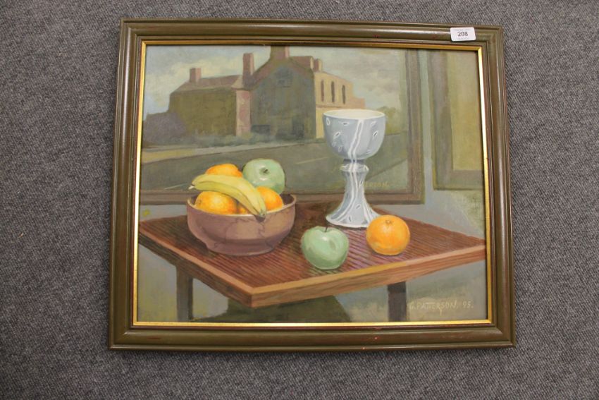 George Patterson: Still life with vase and fruits, oil on canvas, signed, dated '95, 40cm by 50cm. CONDITION REPORT: *** George Patterson (1927 - 2017) was a celebrated artist of the North East and founded the famous Jarrow Art Group along with his friend and fellow painter Ken Stewart. Members of this group also included Kenneth Watts and Vince Ray who were both well-known local artists. George Patterson held a successful solo exhibition at The Customs House in South Shields and went on to develop a loyal following amongst the region's art collectors.