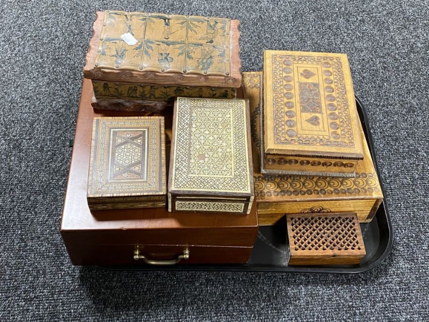 A tray containing Victorian style writing box together with six other antique and later card and game boxes