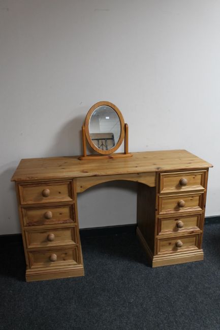 A pine kneehole dressing table fitted with eight drawers together with mirror