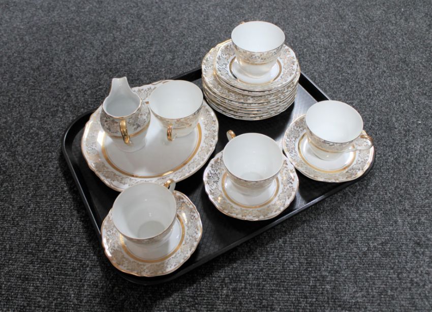 A tray of fifteen piece white and gilt bone china tea service