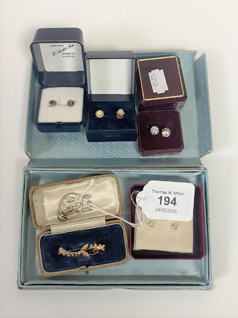 A Victorian 9ct gold garnet set brooch, dress ring, and five pairs of earrings