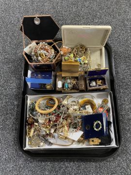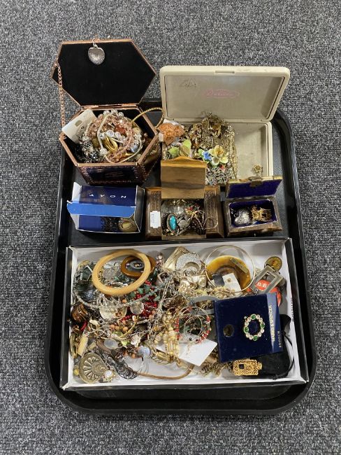 A tray containing a collection of assorted costume jewellery, trinket and jewellery boxes