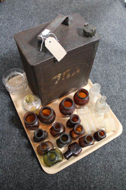 A tray of vintage Esso can, antique glass chemist's bottles