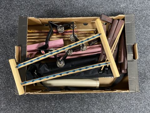 A box of musical instruments to include xylophone, tambourine, drum sticks, folding music stand in carry bag