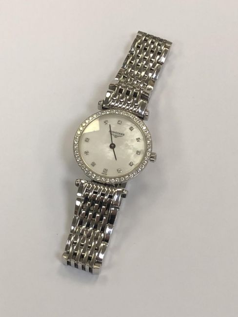 A lady's Longines La Grande Classique wristwatch with diamond set bezel and mother of pearl and diamond dial