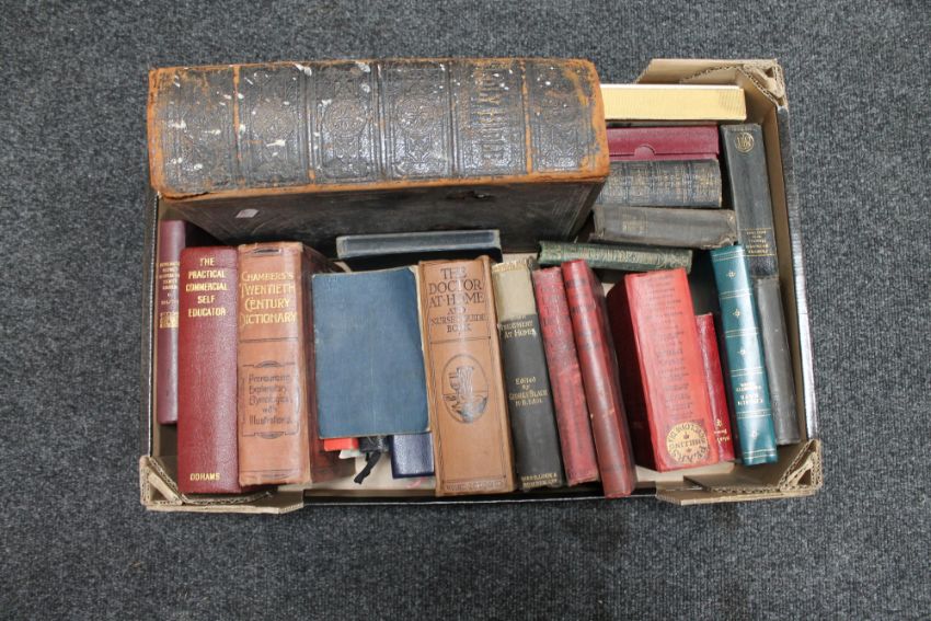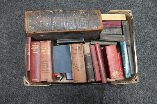 A box of 19th century leather bound bible, antiquarian and later books, home doctor, dictionaries etc