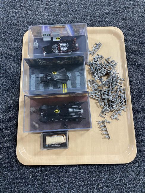 A tray containing miniature lead military figures, three cased Batman die cast vehicles together with a cased VW bus