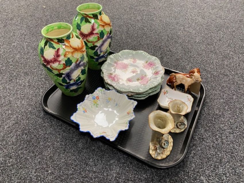 A tray of two Beswick figures (a/f), Maling green lustre vases, dessert plates, Royal Crown Derby pin dish
