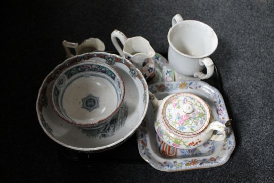 A tray of antique china and pottery to include Imari style jugs, Minton teapot, twin handled mug, comports etc.