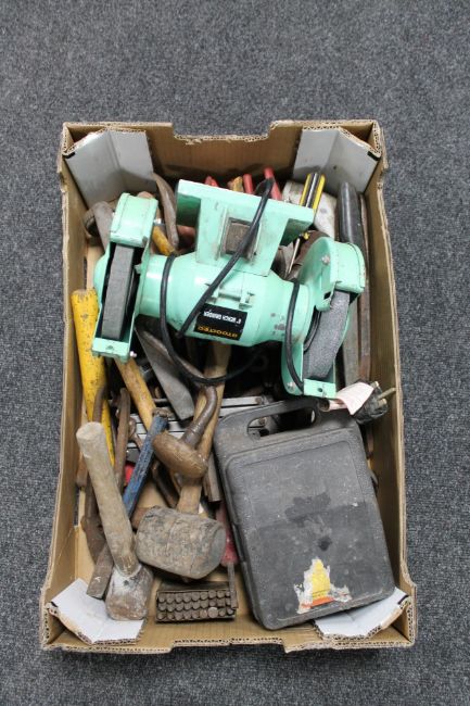 A box of a quantity of vintage hand tools, Tooltec 6" bench grinder