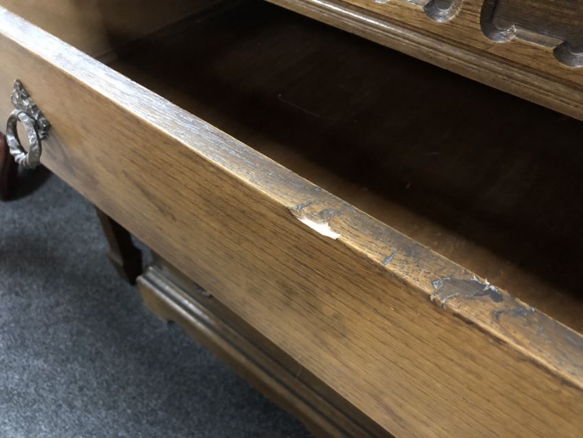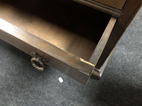 80cm wide by 48cm deep by 85cm high. In good overall condition but two drawers with small veneer losses.