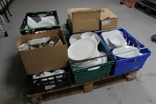 A pallet of six baskets and three boxes of catering crockery and condiment pots.